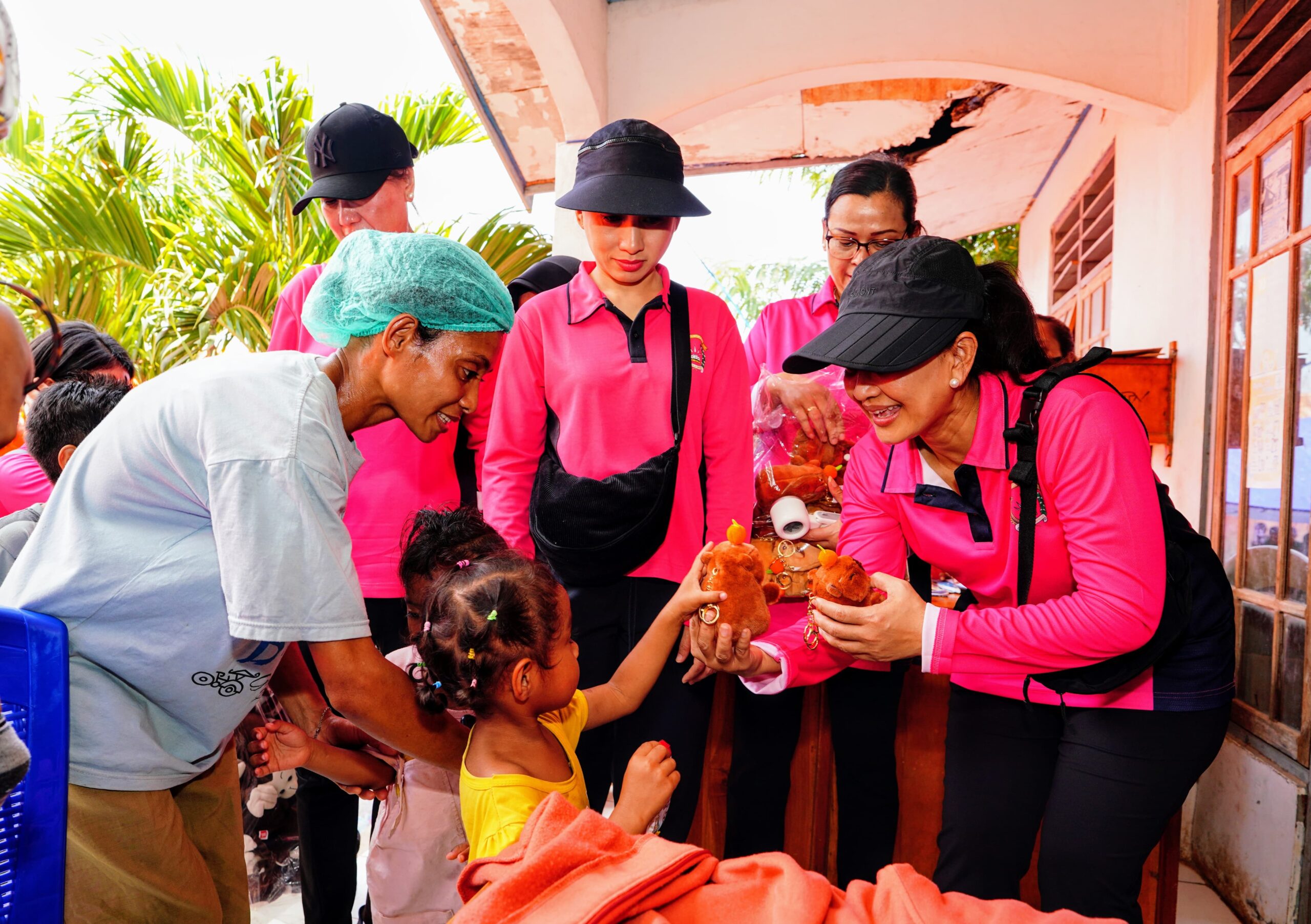 Jakarta. Ketua Umum (Ketum) Bhayangkari, Juliati Sigit Prabowo, meninjau dua posko pengungsian bencana erupsi Gunung Lewotobi Laki-laki di Nusa Tenggara Timur (NTT). Ketum Bhayangkari melihat dapur umum yang didirikan TNI-Polri hingga proses penyulingan air bersih oleh Brimob.