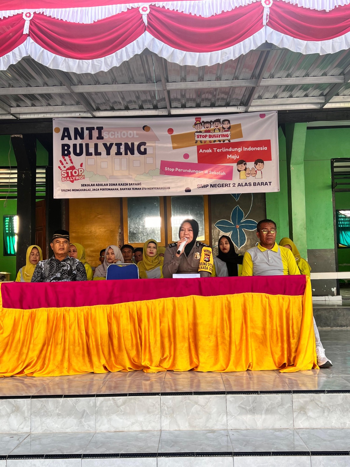 Sumbawa Besar-NTB, Dalam rangka mencegah tindak kekerasan dan bullying di kalangan pelajar, Kanit Binmas Polsek Alas Barat, Aiptu Nyimas Sri Mulyaningsih, melaksanakan kegiatan sebagai narasumber dalam sosialisasi pencegahan kekerasan dan bullying di SMP Negeri 2 Alas Barat, Jumat (15/11/24) pagi.