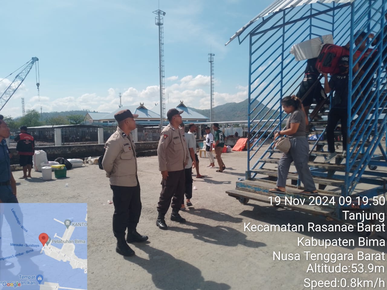 Kota Bima, NTB (19 November 2024) – Polsek Kawasan Pelabuhan Laut Bima melaksanakan pengamanan proses embarkasi dan debarkasi penumpang kapal KM. AWU yang bersandar di Pelabuhan Bima pada Selasa pagi. Pengamanan berlangsung mulai pukul 09.00 WITA di areal Pelabuhan Bima, Jalan R.E. Marthadinata, Kelurahan Tanjung, Kecamatan Rasanae Barat, Kota Bima.