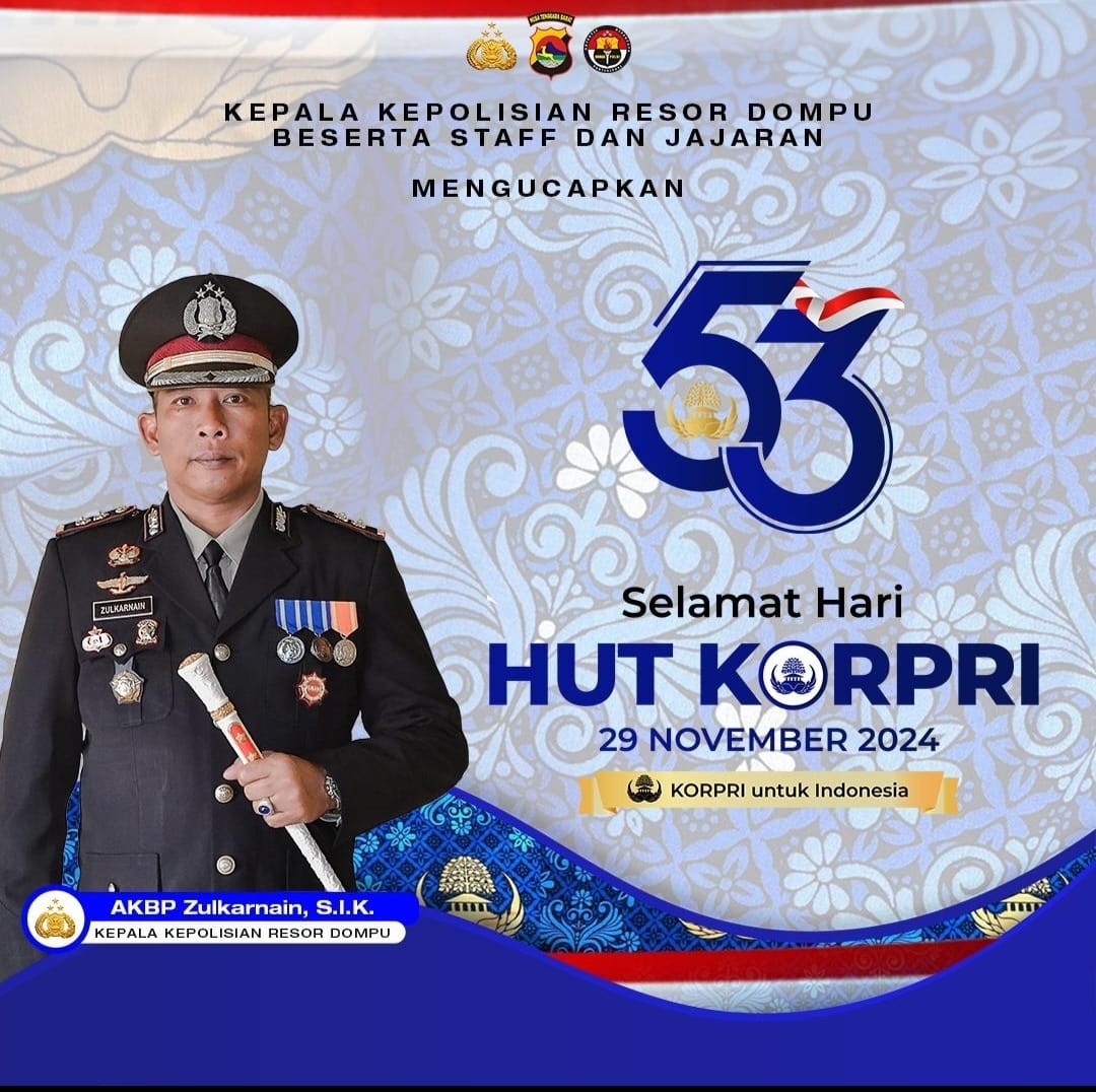 Kapolres Dompu, AKBP Zulkarnain, S.I.K., bersama seluruh jajaran Polres Dompu, menyampaikan ucapan selamat Hari Ulang Tahun (HUT) Korps Pegawai Republik Indonesia (Korpri) ke-53, yang diperingati pada Rabu (29/11/2024).