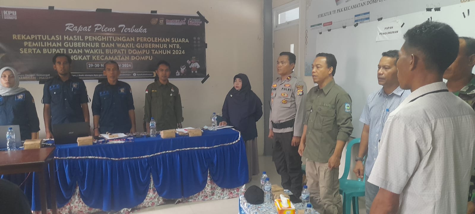 Camat Dompu, Bapak Muhammad Ikhsan, SST, M.T., dalam sambutannya, menegaskan pentingnya menjaga suasana kondusif selama rekapitulasi berlangsung. “Kita semua memiliki tanggung jawab untuk menjaga kelancaran pleno ini sebagai wujud penghormatan terhadap proses demokrasi yang adil dan transparan,” ujarnya.