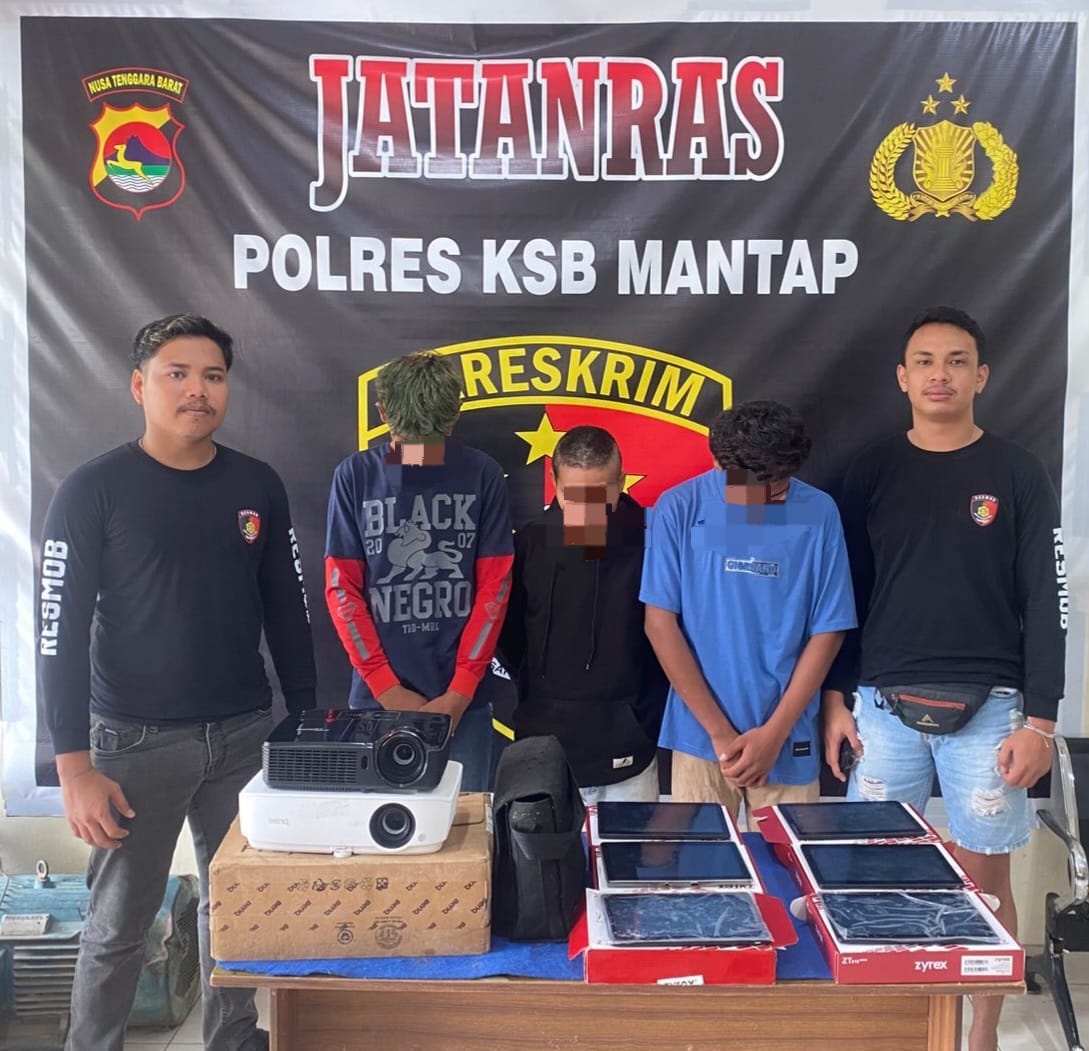 ” Barang bukti yang diamankan polisi berupa 6 ( Enam ) Unit Tablet merk Zyrex warna Hitam, 1 (Satu) Unit Projector Merk Optoma berwarna Hitam dan 1 (Satu) Unit Projector Merk BenQ Berwarna Putih. Adapun ketiga terduga pelaku berinisial AB, 16 tahun asal Kelurahan Telaga Bertong, AN, 16 tahun asal Desa Labuhan Lalar dan ST, 23 tahun asal Desa Labuhan Lalar Kecamatan Taliwang, ” tuturnya