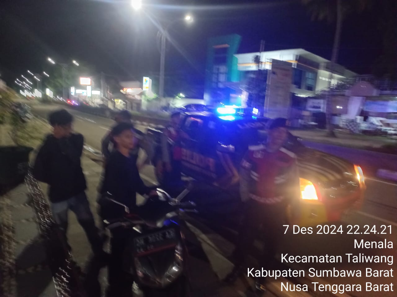 Unit Patroli melaksanakan kegiatan menggunakan kendaraan patroli R4, selanjutnya bertemu dengan sekelompok pemuda yang sedang duduk berkumpul di Alun-alun Kota Taliwang. Dalam kesempatan tersebut, Unit Patroli Sat Samapta Polres Sumbawa Barat mengimbau kepada pemuda yang sedang berkumpul untuk tidak mengkonsumsi minuman keras (miras), obat-obatan terlarang, maupun membawa senjata tajam (sajam) yang dapat mengganggu ketertiban umum.