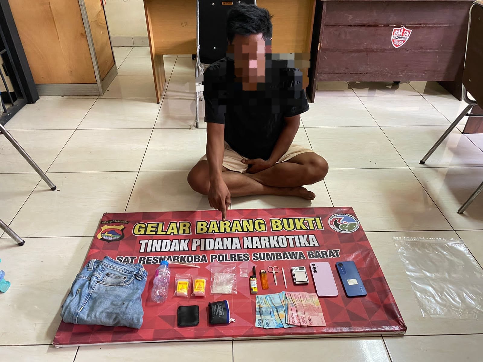 Pada saat petugas bersama saksi-saksi akan melakukan penggeledahan sontak tersangka (MZ) melompat pagar belakang untuk melarikan diri sehingga dikejar oleh petugas dan satu tim lagi melakukan pemeriksaan di dalam rumah tersangka (MZ) dengan disaksikan oleh Kepala Lingkungan dan istri tersangka serta petugas mendapatkan barang bukti berupa: