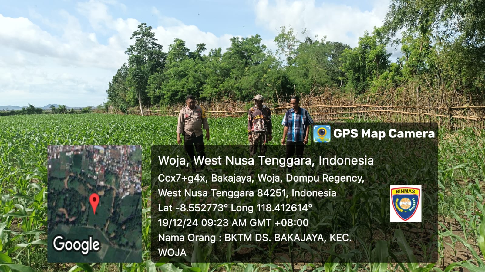 Dalam mendukung Program Ketahanan Pangan Nasional Menuju Indonesia Emas 2045, Bhabinkamtibmas Desa Bakajaya, Polsek Woja, Aipda Ruslansyah melaksanakan pemantauan lahan jagung milik warga binaannya, Ilyas, di Dusun Amamaka, Desa Bakajaya, Kecamatan Woja, Kabupaten Dompu, Senin (23/12/2024).