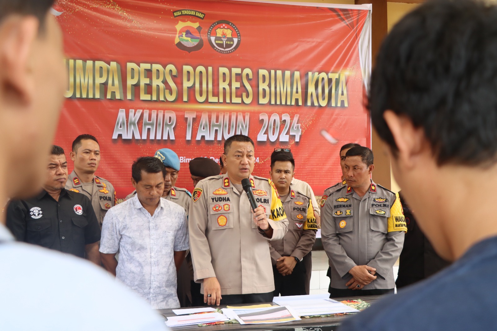 Kota Bima, NTB (28/12) – Kasus tindak kriminal di wilayah hukum Polres Bima Kota sepanjang tahun 2024 menunjukkan tren penurunan dibandingkan tahun sebelumnya. Hal ini diungkapkan oleh Kapolres Bima Kota, AKBP Yudha Pranata, saat konferensi pers di Mako Polres Bima Kota pada Sabtu, 28 Desember 2024.