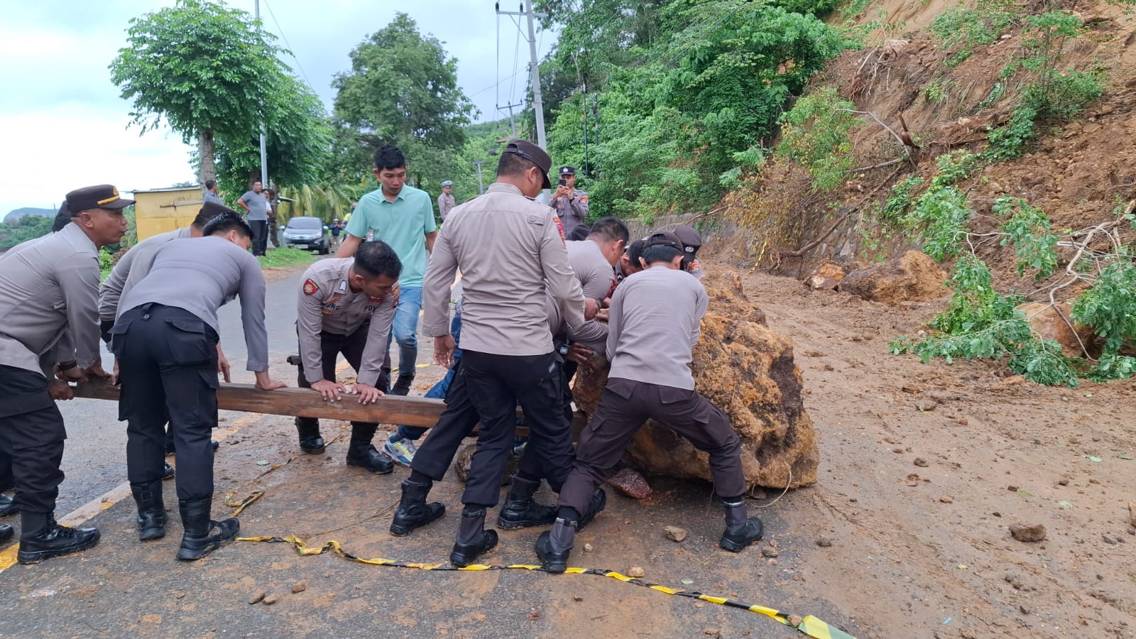 Dengan berbekal tenaga dan tuas kayu, batu yang berada di tengah jalan diungkit dengan tuas dan digeser sedikit demi sedikit. Akhirnya, tim dapat melakukan evakuasi batu dengan ukuran yang cukup besar ke pinggir jalan selama kurang lebih 30 menit.